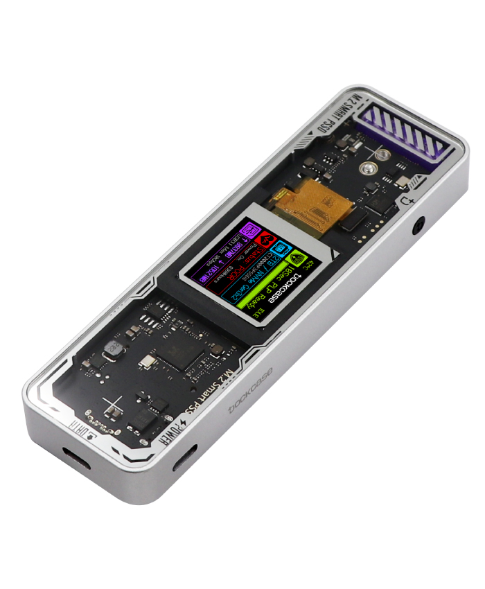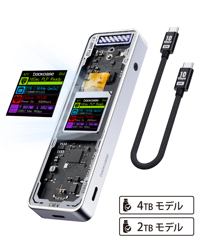 SSDインフォメーションを表示できる ポータブルSSD「LCD搭載 ポータブルSSD ハイスピード 4TB/2TB」は、SSDインフォメーションを表示できる ポータブルSSDです。通常パソコンで管理しなければならないSSDの動作状況やヘルスチェックを本製品に搭載されている液晶モニターでリアルタイムに確認できます。また、PLP機能も搭載されており、予期せぬ電源遮断の際にもSSD内のデータ損失を最小限に防ぎます。補助電源接続も可能でWindowsやMacのパソコンの他にもType-C接続のスマートフォンやタブレットでも幅広くご利用いただけます。
