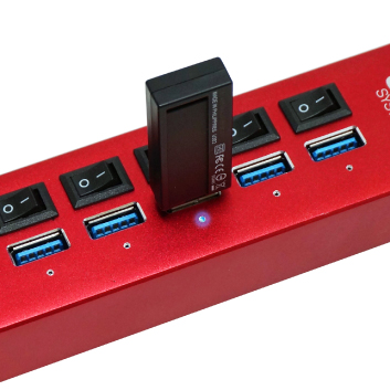 わかりやすい3色通電LED!「JUSTロゴ入 オールスイッチ式 ハイブリッド USB3.0ハブ」は 現在の使用状況が一目でわかるように通電ランプを採用しました。