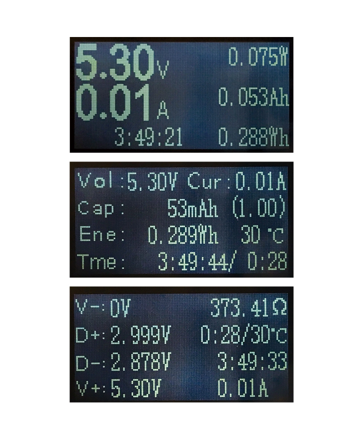 電圧 : 3~30V (測定単位: 0.01V) 電流 : 0~5.1A (測定単位: 0.01A) 積算電流量 : 0~99999mAh (測定単位: 0.001Ah) 積算電力量 : 0~999999mWh (測定単位: 0.001Wh) 電力 : 0~299.999W (測定単位: 0.001W) 接続時間 : 0~999時間59分59秒 (測定単位: 1秒) |