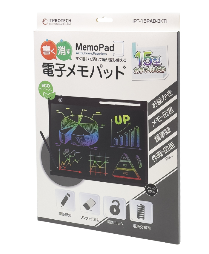 書く・消す 繰り返し使える 電子メモパッドIPT-15PAD-BKTIは、ペーパーレス実現へ薄型軽量に設計された電子メモパッドです。付属のペンや爪でも直接書くことができ、ワンタッチで消去ができます。電池交換もすることができ半永久的にくり返し使用できます。