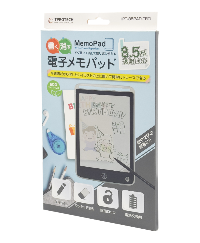 書く・消す 繰り返し使える 電子メモパッドIPT-85PAD-TRTIは、透明LCD仕様となっており、書きたいものや描きたいものに重ねてなぞることができます。付属のペンや爪でも直接書くことができ、ワンタッチで消去ができますので、ペーパーレスで字の練習や絵の練習に最適に利用できます。