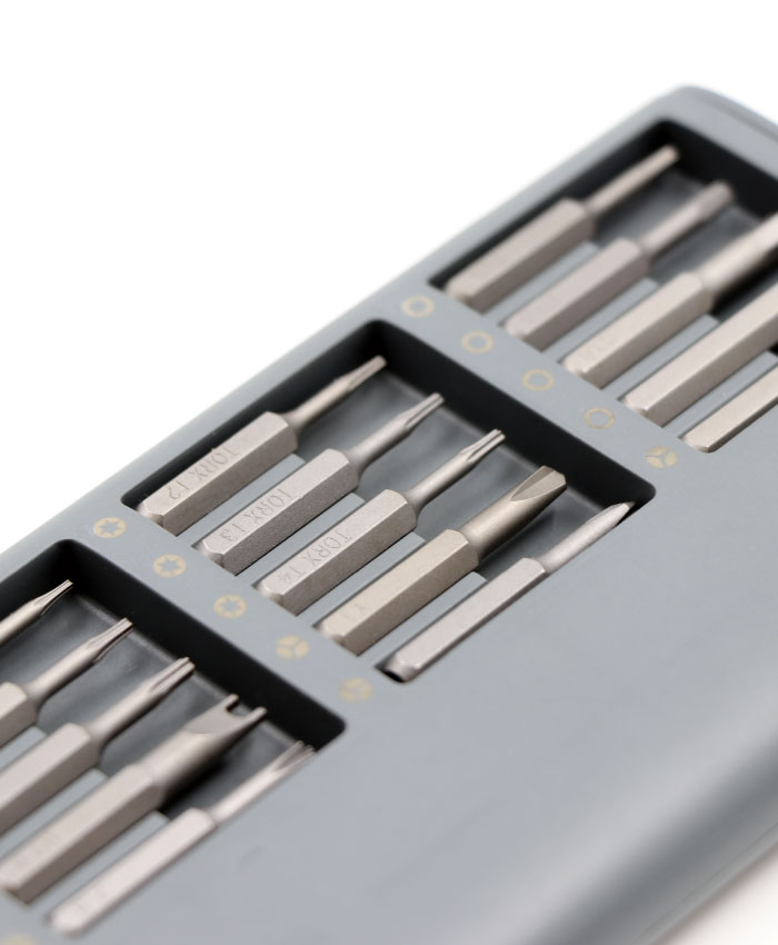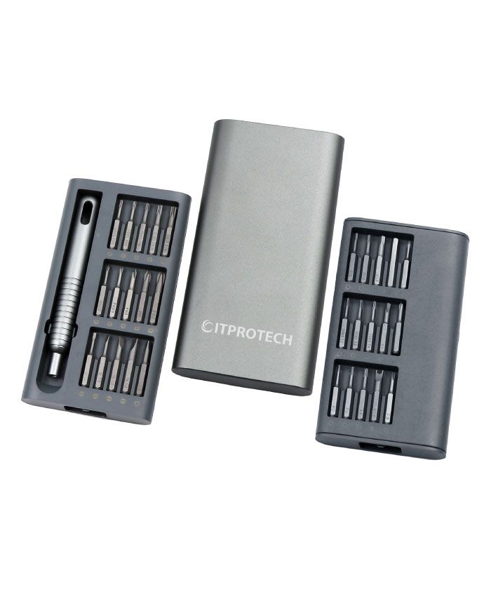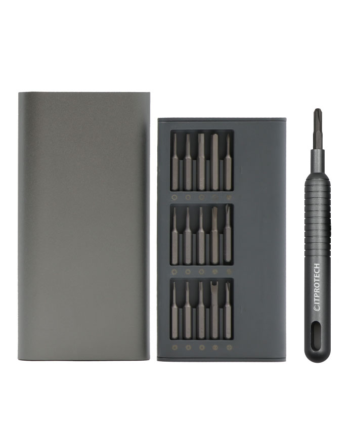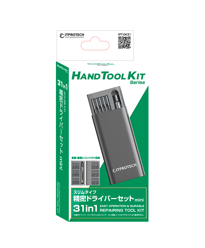 31in1精密ドライバーセット本製品は、小型の精密ドライバーセットで、スマートフォン、パソコン本体、ゲーム機、カメラなどの修理で細かな作業に最適です。好評の49in1モデル(IPT-DK49)をさらに小型化し厳選された30種のビットと専用のドライバーのセットです。わずか15㎜厚のアルミ製ポータブルケースに収納できる設計になっており持ち運びにもとても便利です。